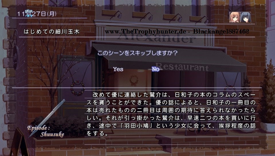 Aber da es trotzdem eine sehr schöne Novelle ist, da man sie durch Vita und PS3 Version direkt mit beiden Systemen auf einmal erspielen kann, ist es möglich in 8 Stunden sich beide Platins einzusacken. Somit bearbeite ich den Guide von Merlin-87 einmal weiter, damit ihr ihn schön von oben nach unten abarbeiten könnt ;)