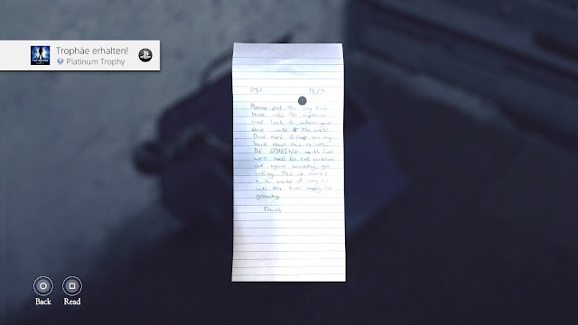 Nun einfach den Textguide folgen und man hat in 1,5 bis 2 Stunden die Platin. Wichtig dabei ist bloß, dass man jedes Dokument was man liest, sich auch genauer anschaut. Quasi nicht nur ein Clipboard in die Hand nehmen, um zu sehen was darauf steht, sondern auch nochmal extra Viereck klicken um den Text nochmal vergrößert angezeigt zu bekommen. Macht man dies nicht, zählt der jeweilige Gegenstand nicht für die Trophy. Quasi einmal nicht Viereck, hat man die Goldtrophy verpasst und darf das Game erneut zu rund 80% durchspielen - was ich bei diesem Titel leider machen musste, vermutlich hab ich genau 1x vergessen Viereck zu drücken und dann kann man leider nur nach dem Durchspielen ein neues Spiel starten und muss dann erneut vom ersten bis zum letzten Dokument spielen. Ist also nicht zu empfehlen, denn so bin ich auf knapp 4 Stunden Platindauer gekommen, obwohl 1,5 Stunden möglich wären. Schade ;)